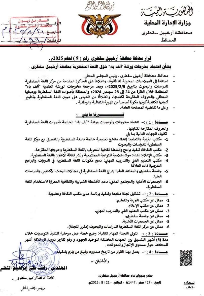 أصدر محافظ المحافظة المهندس رأفت علي الثقلي، امس الخميس، القرار رقم (9) لسنة 2025م، القاضي باعتماد مخرجات ورشة "ألف باء" الخاصة بتوصيف أصوات اللغة السقطرية وإقرار حروفها الكتابية.