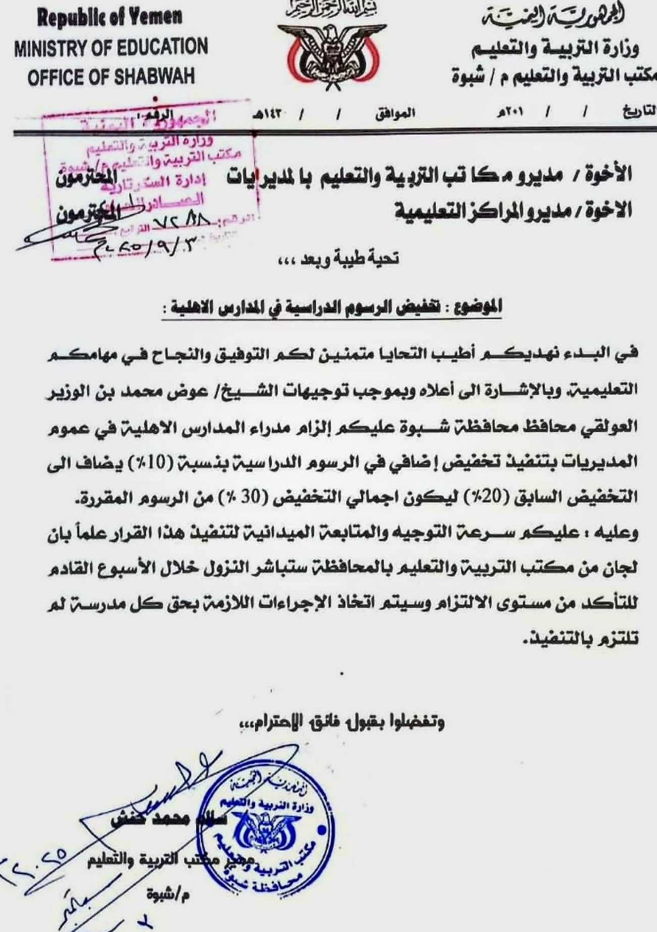 في خطوة نوعية تهدف إلى التخفيف عن كاهل الأسر ومراعاةً للظروف المعيشية الصعبة، أصدر مكتب التربية والتعليم بمحافظة شبوة قرارًا يقضي بتخفيض الرسوم الدراسية في المدارس الأهلية بنسبة (30%)، وذلك استنادًا إلى توجيهات محافظ المحافظة ورئيس المجلس المحلي عوض محمد بن الوزير.