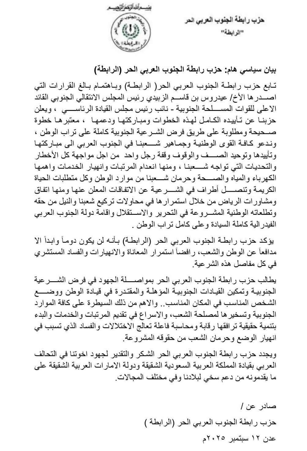 تابع حزب رابطة الجنوب العربي الحر( الرابطة) وبأهتمام بالغ القرارات التي اصدرها الأخ/ عيدروس بن قاسم الزبيدي رئيس المجلس الانتقالي الجنوبي القائد الاعلى للقوات المسلحة الجنوبية - نائب رئيس مجلس القيادة الرئاسي ، ويعلن حزبنا عن تأييده الكامل لهذه الخطوات ومباركتها ودعمها ، معتبرها خطوة صحيحة ومطلوبة على طريق فرض الشرعية الجنوبية كاملة على تراب الوطن ، وندعو كافة القوى الوطنية وجماهير شعبنا في الجنوب العربي الى مباركتها وتأييدها وتوحيد الصف والوقوف وقفة رجل واحد من اجل مواجهة كل الأخطار والتحديات التي تواجه شعبنا ، ومنها انعدام المرتبات وانهيار الخدمات واهمها الكهرباء والمياه والصحة وحرمان شعبنا من موارد الوطن وكل متطلبات الحياة الكريمة وتنصل أطراف في الشرعية عن الاتفاقات المعلن عنها ومنها اتفاق ومشاورات الرياض من خلال استمرارها في محاولات تركيع شعبنا والنيل من حقه وتطلعاته الوطنية المشروعة في التحرير والاستقلال واقامة دولة الجنوب العربي الفيدرالية كاملة السيادة وعلى كامل تراب الوطن .