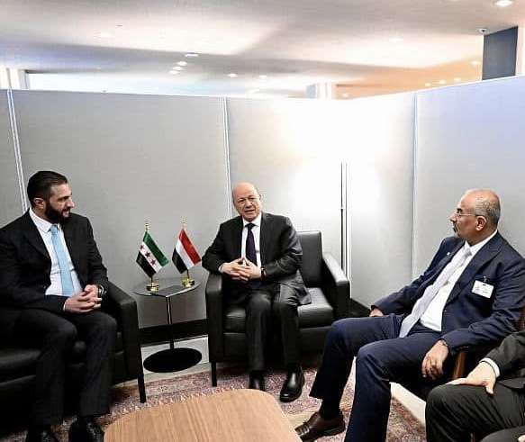 التقى فخامة الرئيس الدكتور رشاد محمد العليمي، رئيس مجلس القيادة الرئاسي اليوم الثلاثاء في نيويورك، ومعه عضوا المجلس اللواء عيدروس الزبيدي، والدكتور عبدالله العليمي، فخامة الرئيس احمد الشرع، رئيس الجمهورية العربية السورية، وذلك على هامش اجتماعات الجمعية العامة للأمم المتحدة.