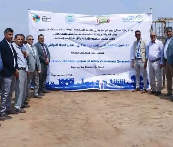 دشن معالي وزير الزراعة والري والثروة السمكية، اللواء سالم السقطري، بمعية نائب محافظ العاصمة عدن الأمن العام للمجلس المحلي، بدر معاون، ومدير مكتب منظمة الأغذية والزراعة "الفاو"، الدكتور علي جالول، اليوم، مشروع إعادة تأهيل المحجر البيطري، بتمويل من صندوق الجائحة بمبلغ 300 ألف دولار، الهادف إلى مواجهة التحديات وتقليل الآثار السلبية على المجتمع والاقتصاد.