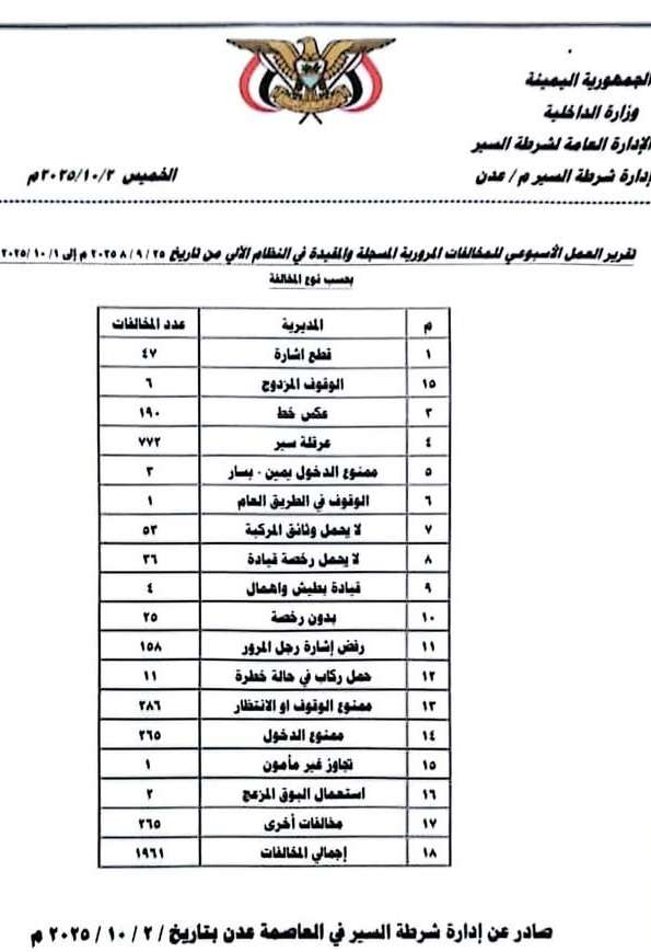 أعلنت شرطة السير في العاصمة عدن أن إجمالي المخالفات المرورية المسجَّلة خلال الفترة من 26 سبتمبر حتى 1 أكتوبر 2025م، بلغ (1971) مخالفة مرورية، بزيادة قدرها 90 مخالفة عن الأسبوع الماضي.
