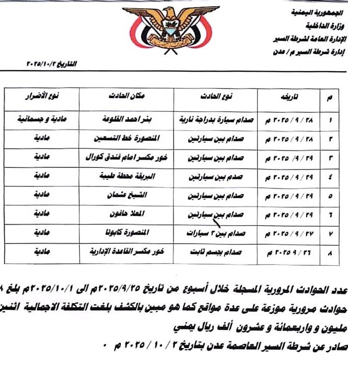 وأوضحت الإحصائية أن العاصمة عدن شهدت خلال الفترة نفسها (8) حوادث مرورية في عدد من المديريات، مسجّلة انخفاضًا بنسبة 43% مقارنة بالأسبوع السابق، مع تسجيل خسائر مادية قُدِّرت بنحو 2,420,000 ريال (مليونين وأربعمائة وعشرون ألف ريال).