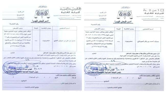أفادت مصادر قضائية أن النيابة العامة أصدرت أوامر قبض قهرية بحق كلٍ من عمرو بن حبريش ومبارك أحمد العوبثاني على خلفية اتهامات بارتكاب أفعال يعاقب عليها القانون.