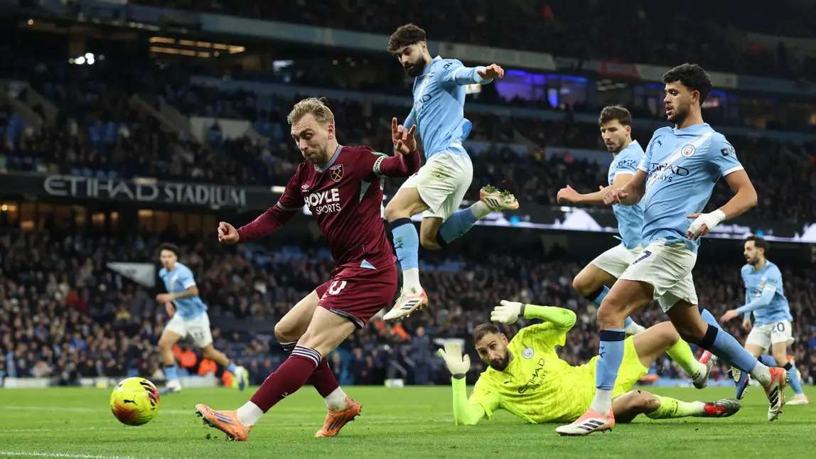 وأهدر وست هام فرصة كبيرة للتسجيل في الدقيقة 54، بعد ارتباك من دفاع السيتي في إبعاد الكرة، ليفتكها بوين ويراوغ دوناروما قبل أن يسدد كرة مرت إلى جوار القائم.