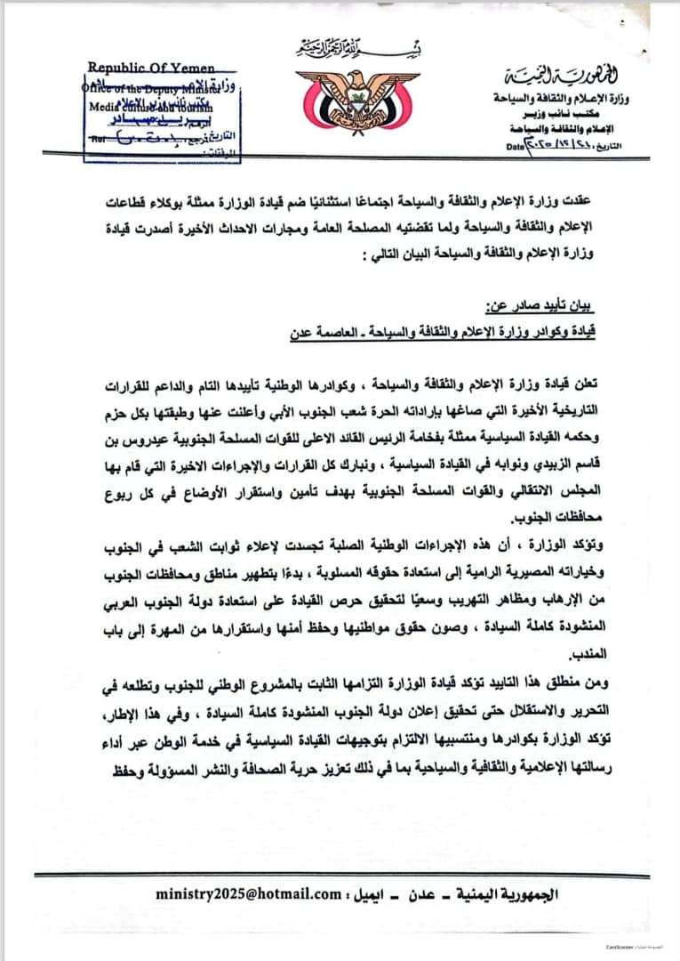 وأكد البيان التزام قيادة الوزارة وكوادرها بالمشروع الوطني الجنوبي، وتمسّكها بتطلعات الشعب في التحرير والاستقلال، مع مواصلة أداء رسالتها الإعلامية والثقافية والسياحية لخدمة المواطن، وتعزيز حرية الصحافة المسؤولة، وحفظ التراث الوطني، والنهوض بالقطاع السياحي.