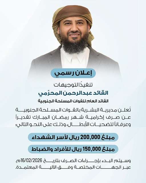 تنفيذاً لتوجيهات القائد عبدالرحمن المحرّمي، القائد العام للقوات المسلحة الجنوبية.. أعلنت مديرية البشرية العامة بالقوات المسلحة الجنوبية، عن صرف إكرامية شهر رمضان المبارك تقديراً وعرفاناً لتضحيات أبطال القوات المسلحة الجنوبية.
