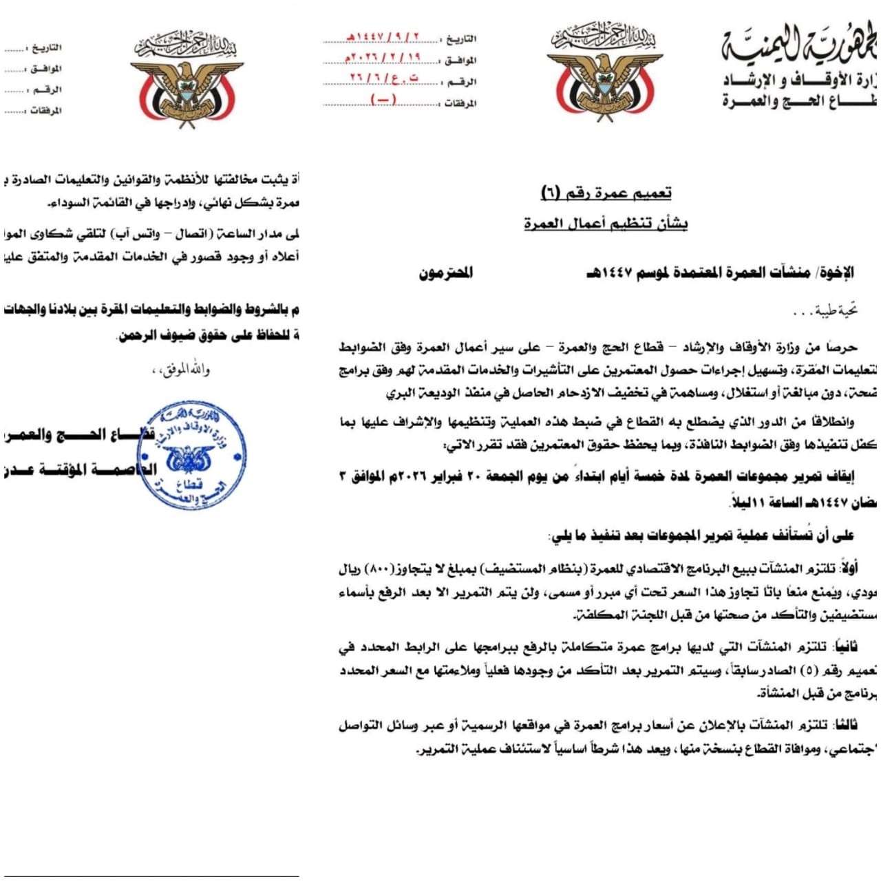 إلى ذلك قررت وزارة الأوقاف إيقاف تمرير مجموعات العمرة لمدة خمسة أيام، ابتداء من يوم غد الجمعة 20 فبراير 2026 الموافق 3 رمضان 1447، الساعة 11 ليلاً، وذلك حرصاً منها على التخفيف من الإزدحام في منفذ الوديعة الحدودي مع المملكة العربية السعودية.