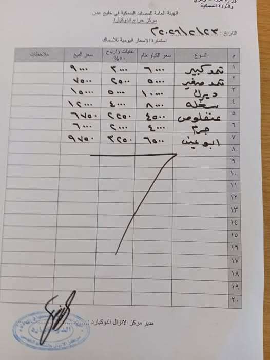 أعلنت الهيئة العامة للمصائد السمكية، صباح اليوم الاثنين، الأسعار الرسمية المعتمدة لبيع الأسماك في مركز حراج الدويكيارد بمديرية المعلا في العاصمة عدن، وذلك في إطار جهودها لتنظيم عملية البيع وضبط الأسعار بما يحقق التوازن بين مصلحة الصيادين والمستهلكين.