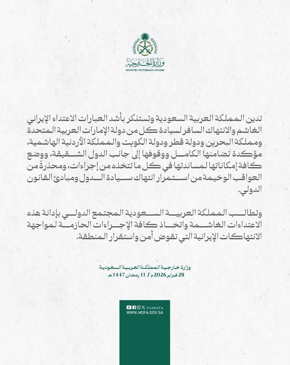 أعربت المملكة العربية السعودية عن إدانتها واستنكارها الشديدين للاعتداء الإيراني الذي استهدف سيادة كل من دولة الإمارات العربية المتحدة، ومملكة البحرين، ودولة قطر، ودولة الكويت، والمملكة الأردنية الهاشمية.