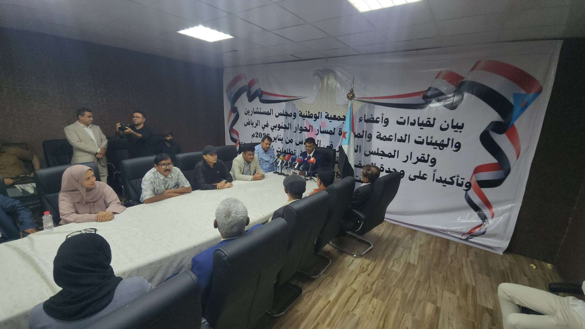 تحت راية الجنوب وهويته، ونعلن تأييدنا الكامل والمطلق لمسار الحوار الجنوبي الذي ترعاه المملكة العربية السعودية الشقيقة.والذي يمثل فرصة تاريخية واستراتيجية لقضيتنا في هذا التوقيت الحساس، مؤمنين بأن بناء الدولة يبدأ من الحفاظ على النسيج الاجتماعي وتحكيم لغة العقل والمنطق.