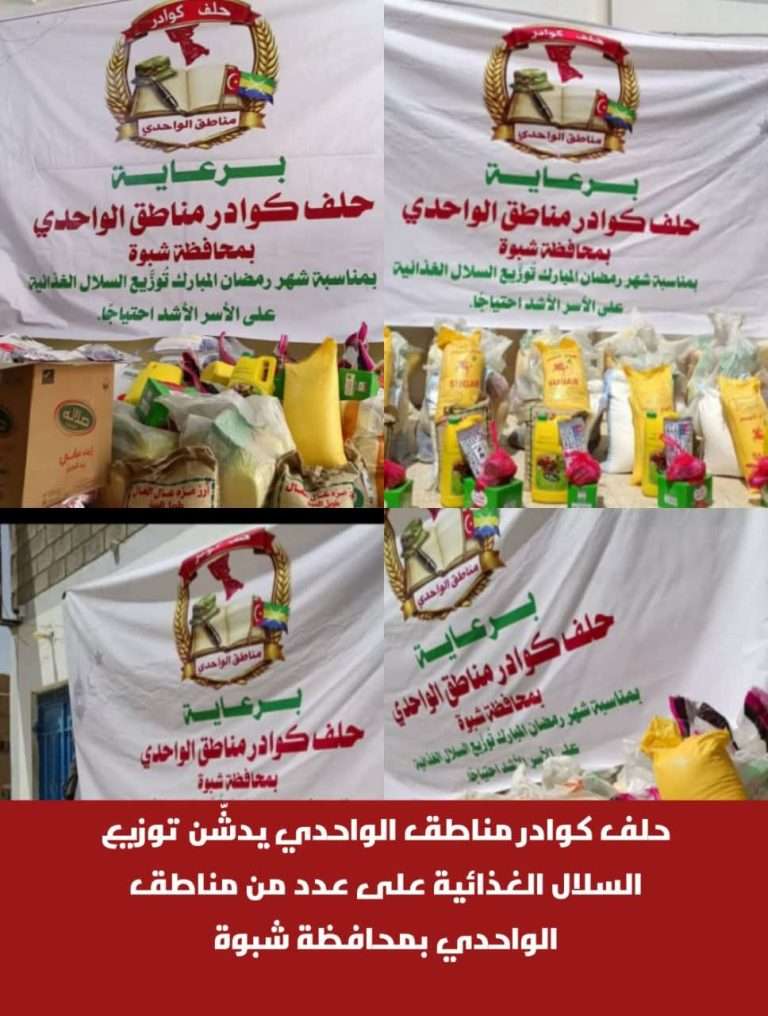 #حلف كوادر مناطق الواحدي يدشّن توزيع السلال الغذائية على عدد من مناطق الواحدي بمحافظة شبوة
