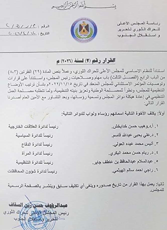 أصدرت رئاسة المجلس الأعلى للحراك الثوري لتحرير واستقلال الجنوب القرار رقم (2) لسنة 2023م، في خطوة تهدف إلى إعادة ترتيب البنية التنظيمية وتفعيل أداء الدوائر القيادية.