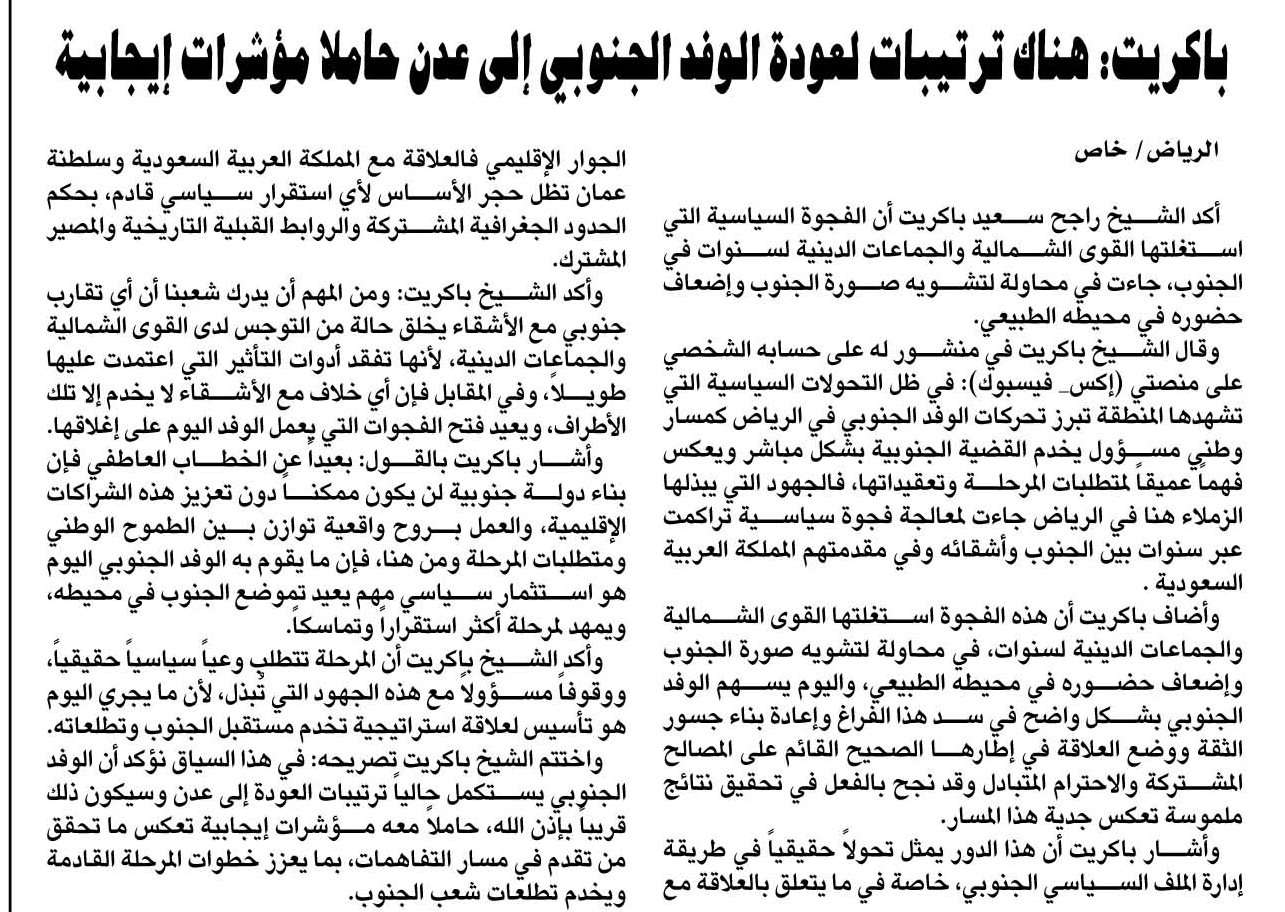 باكريت: هناك ترتيبات لعودة الوفد الجنوبي إلى عدن حاملاً مؤشرات ايجابية