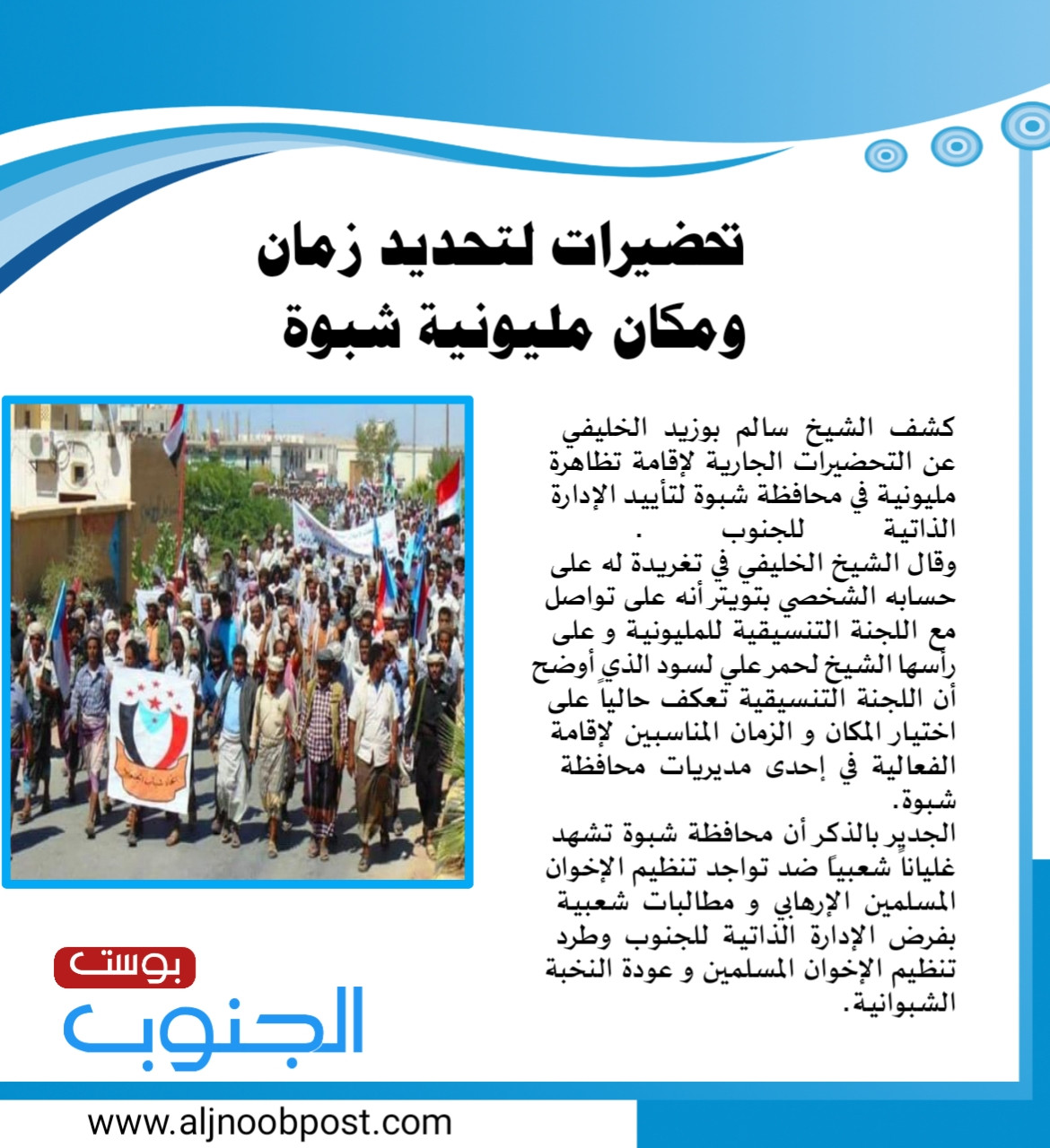 وقال الشيخ الخليفي في تغريدة له على حسابه الشخصي بتويتر أنه على تواصل مع اللجنة التنسيقية للمليونية و على رأسها الشيخ لحمر علي لسود الذي أوضح أن اللجنة التنسيقية تعكف حالياً على اختيار المكان و الزمان المناسبين لإقامة الفعالية في إحدى مديريات محافظة شبوة.