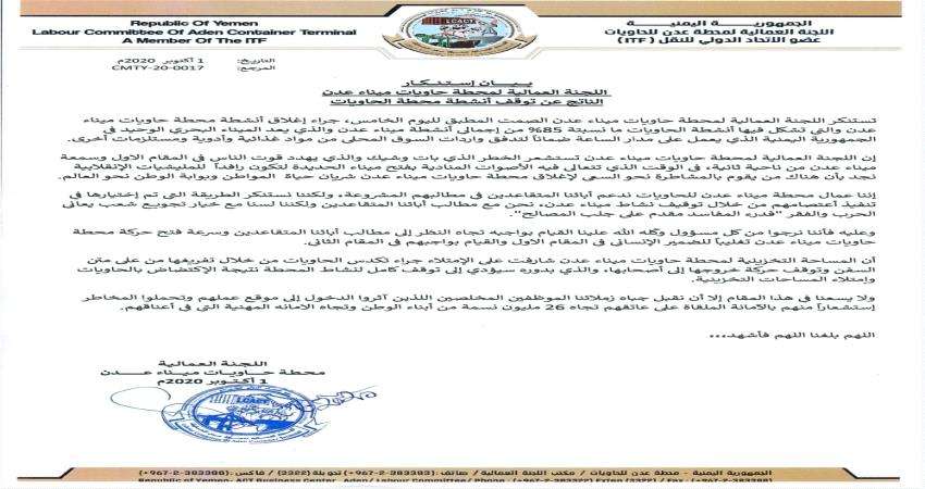 وقالت اللجنة العمالية في بيان لها انها تستنكر اغلاق المحطة التي تشكل فيها أنشطة الحاويات ما نسبته 85% من إجمالي أنشطة ميناء عدن والذي يعد الميناء البحري الوحيد في الجمهورية اليمنية الذي يعمل على مدار الساعة ضماناً لتدفق واردات السوق المحلي من مواد غذائية وأدوية ومستلزمات أخرى.