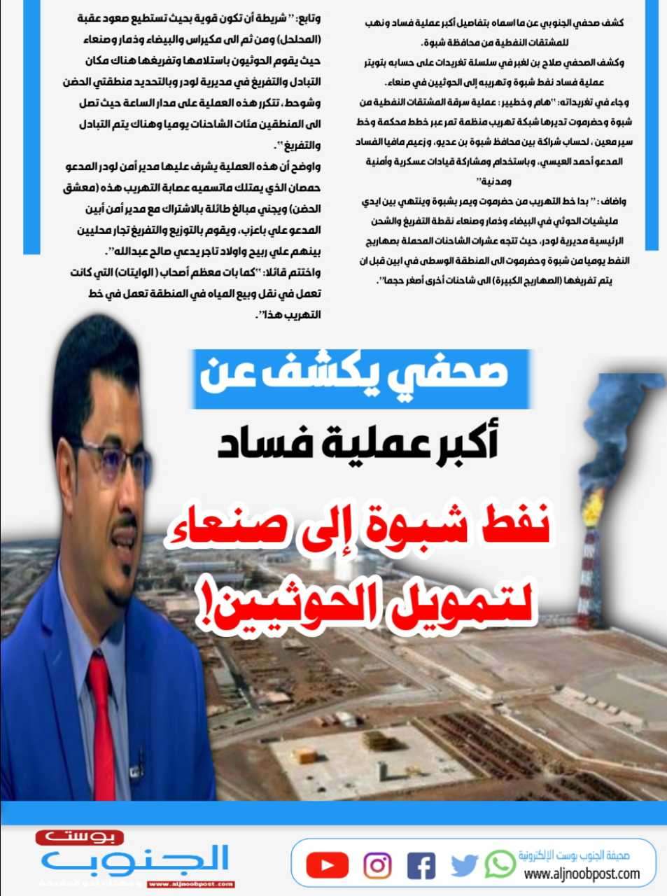 وكشف الصحفي صلاح بن لغبر في سلسلة تغريدات على حسابه بتويتر عملية فساد نفط شبوة وتهريبه إلى الحوثيين في صنعاء.