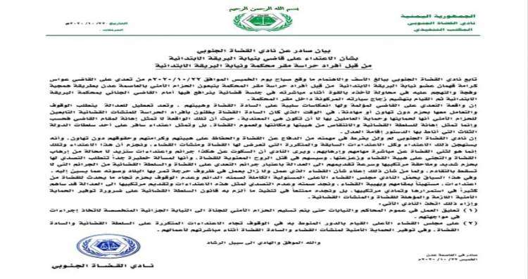 "يحيي نادي القضاة الجنوبي ويثمن عالياً التزام السادة القضاة في عموم المحاكم والنيابات بتنفيذ ما قرره النادي في بيانه الصادر يوم الخميس الفائت الموافق ٢٢/ ١٠/ ٢٠٢٠م بشأن تعليق العمل في المحاكم والنيابات حتى يقوم الحزام الأمني بالعاصمة عدن بتسليم الجنود حراسة مقر محكمة ونيابة البريقة الابتدائيتين المتورطين في التعدي على مقام القاضي عضو نيابة البريقة الابتدائية الى النيابة.