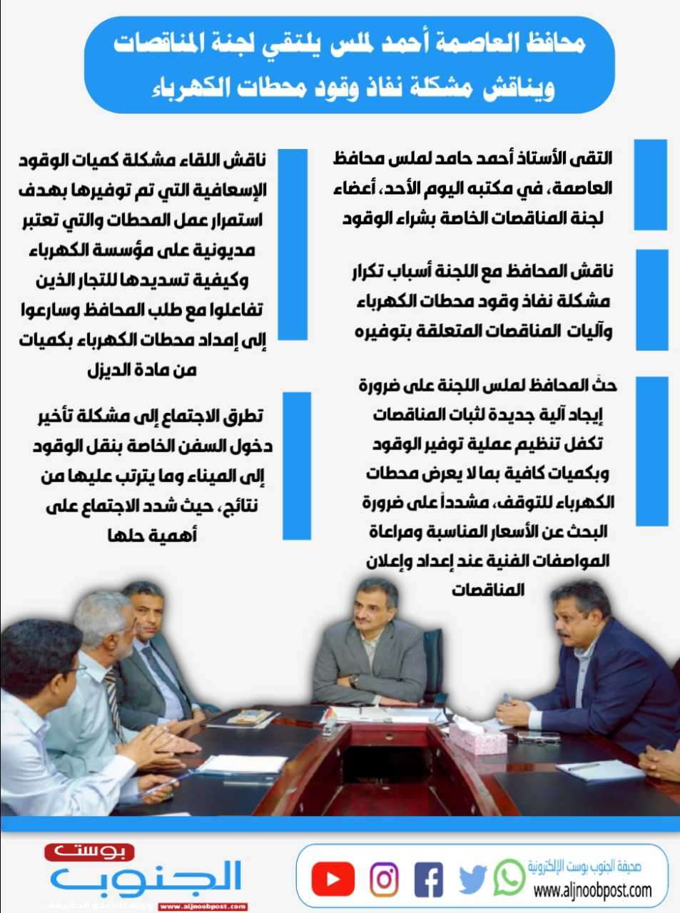 أنفوجرافيك: محافظ العاصمة أحمد لملس يلتقي لجنة المناقصات ويناقش مشكلة نفاذ وقود محطات الكهرباء