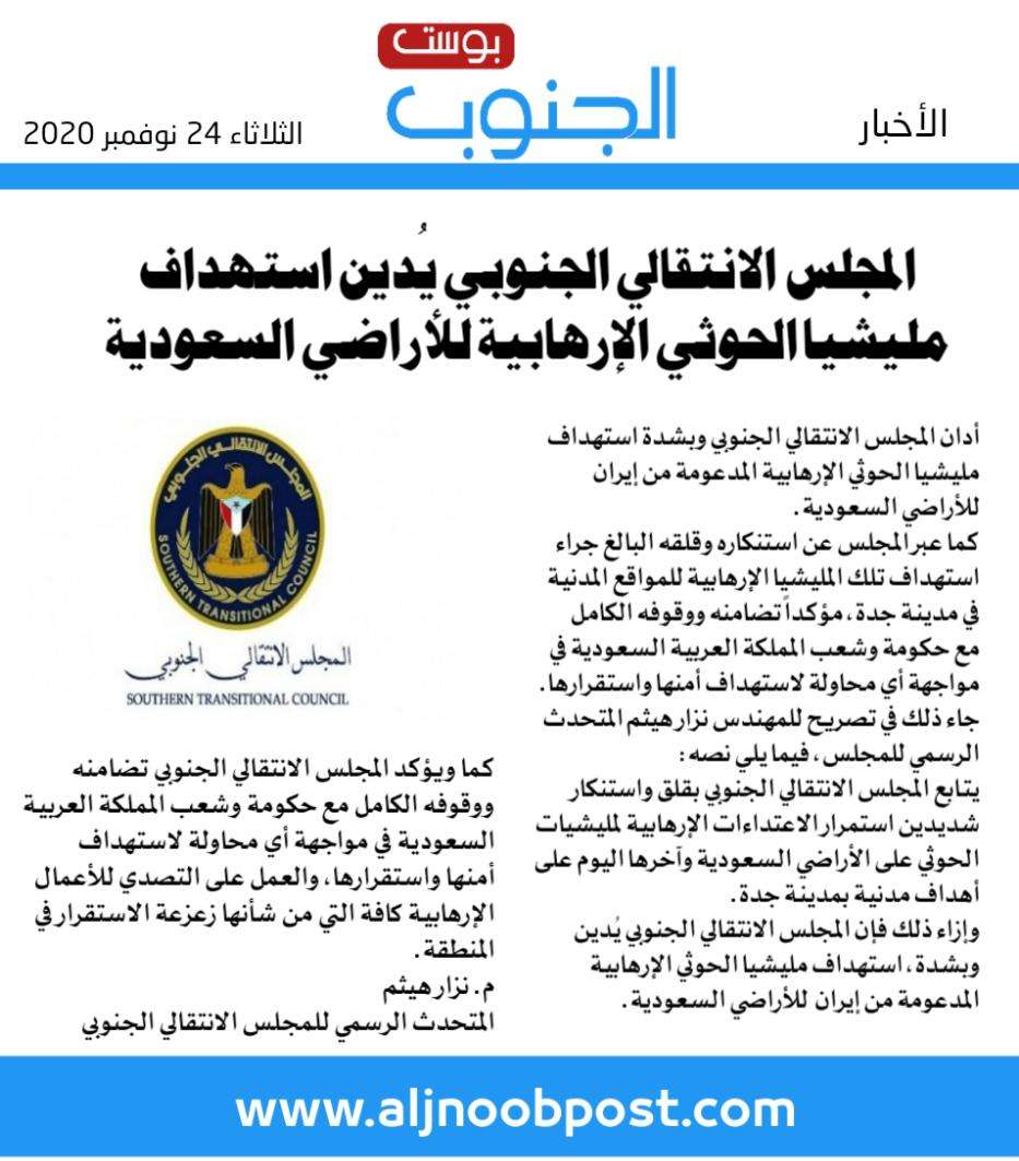 يتابع المجلس الانتقالي الجنوبي بقلق واستنكار شديدين استمرار الاعتداءات الإرهابية لمليشيات الحوثي على الأراضي السعودية وآخرها اليوم على أهداف مدنية بمدينة جدة.
