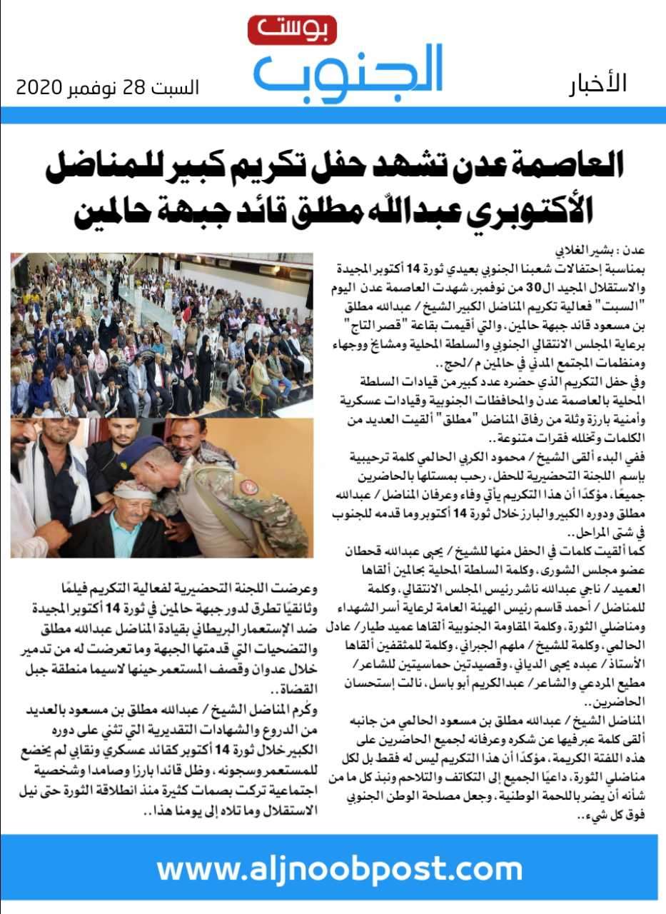 بمناسبة إحتفالات شعبنا الجنوبي بعيدي ثورة 14 أكتوبر المجيدة والاستقلال المجيد ال30 من نوفمبر، شهدت العاصمة عدن اليوم "السبت" فعالية تكريم المناضل الكبير الشيخ/ عبدالله مطلق بن مسعود قائد جبهة حالمين، والتي أقيمت بقاعة "قصر التاج" برعاية المجلس الانتقالي الجنوبي والسلطة المحلية ومشايخ ووجهاء ومنظمات المجتمع المدني في حالمين م/لحج..