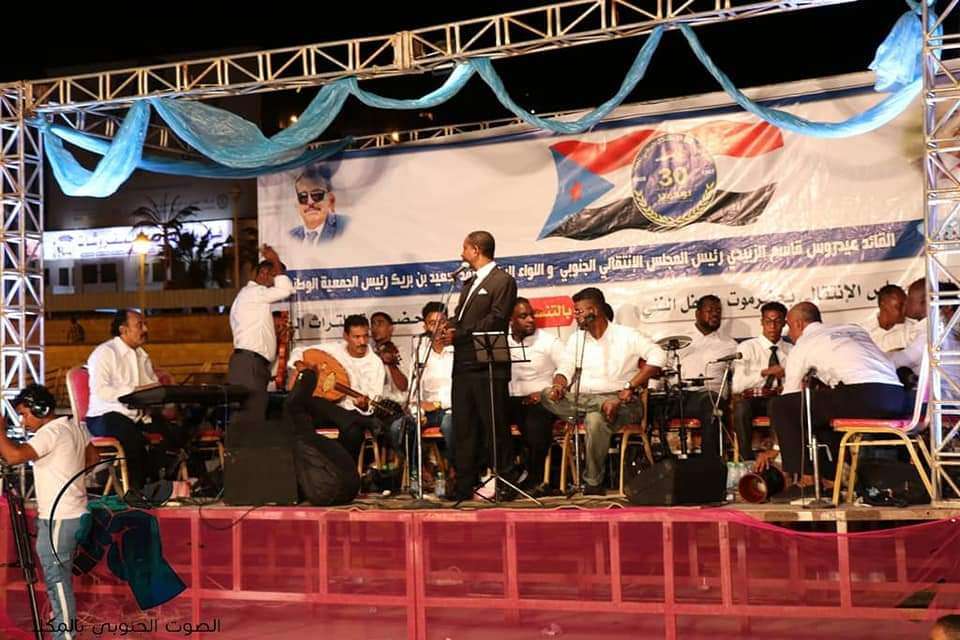 نظمت القيادة المحلية للمجلس بمحافظة حضرموت ، ومؤسسة حضرموت للتراث الفني ، بساحة خور المكلا، ليلة أمس الجمعة، حفلا فنيا غنائيا كبيرا ، بمناسبة العيد الـ53 لـ30 من نوفمبر ، يوم الاستقلال المجيد ، والثاني من ديسمبر ، الذكرى الـ49 لقيام اتحاد دولة الإمارات العربية المتحدة، برعاية كريمة منةالرئيس القائد عيدروس بن قاسم الزُبيدي، رئيس المجلس الانتقالي الجنوبي ، واللواء الركن أحمد سعيد بن بريك رئيس الجمعية الوطنية.