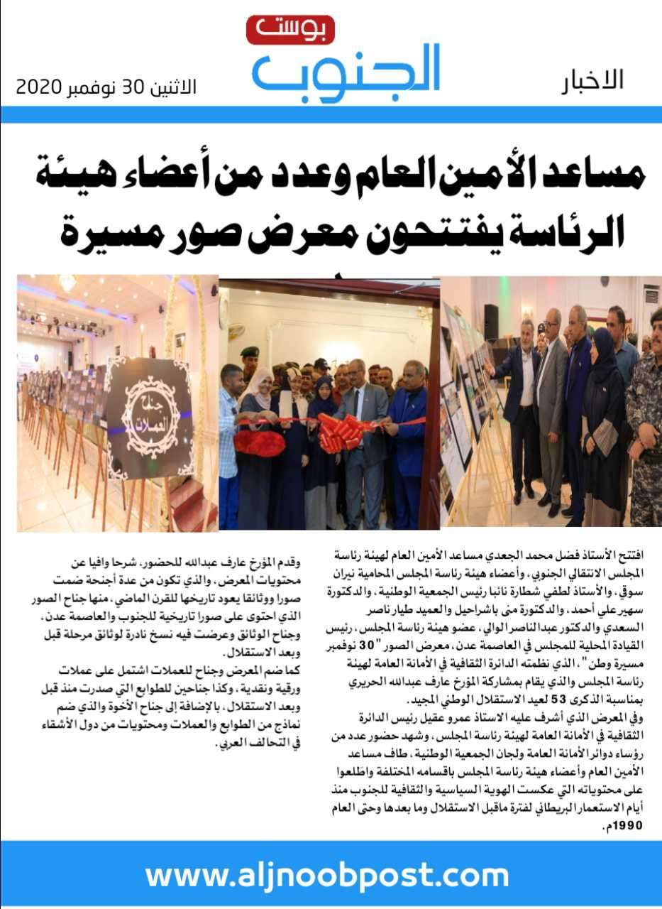افتتح الأستاذ فضل محمد الجعدي مساعد الأمين العام لهيئة رئاسة المجلس الانتقالي الجنوبي، وأعضاء هيئة رئاسة المجلس المحامية نيران سوقي، والأستاذ لطفي شطارة نائبا رئيس الجمعية الوطنية، والدكتورة سهير علي أحمد، والدكتورة منى باشراحيل والعميد طيار ناصر السعدي والدكتور عبدالناصر الوالي، عضو هيئة رئاسة المجلس، رئيس القيادة المحلية للمجلس في العاصمة عدن، معرض الصور "30 نوفمبر مسيرة وطن"، الذي نظمته الدائرة الثقافية في الأمانة العامة لهيئة رئاسة المجلس والذي يقام بمشاركة المؤرخ عارف عبدالله الحريري بمناسبة الذكرى 53 لعيد الاستقلال الوطني المجيد.