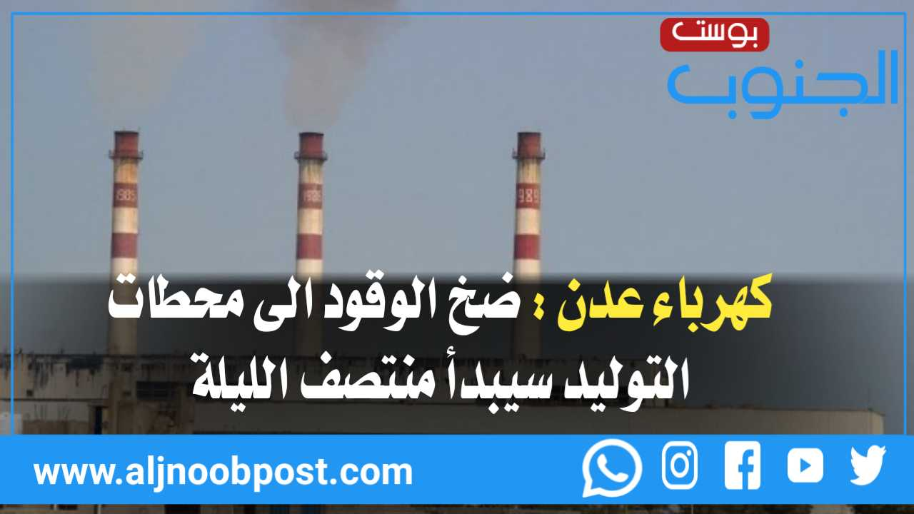 اكدت المؤسسة العامة لكهرباء عدن ان ضخ وقود الديزل الى محطات توليد الكهرباء سيبدأ منتصف الليلة.