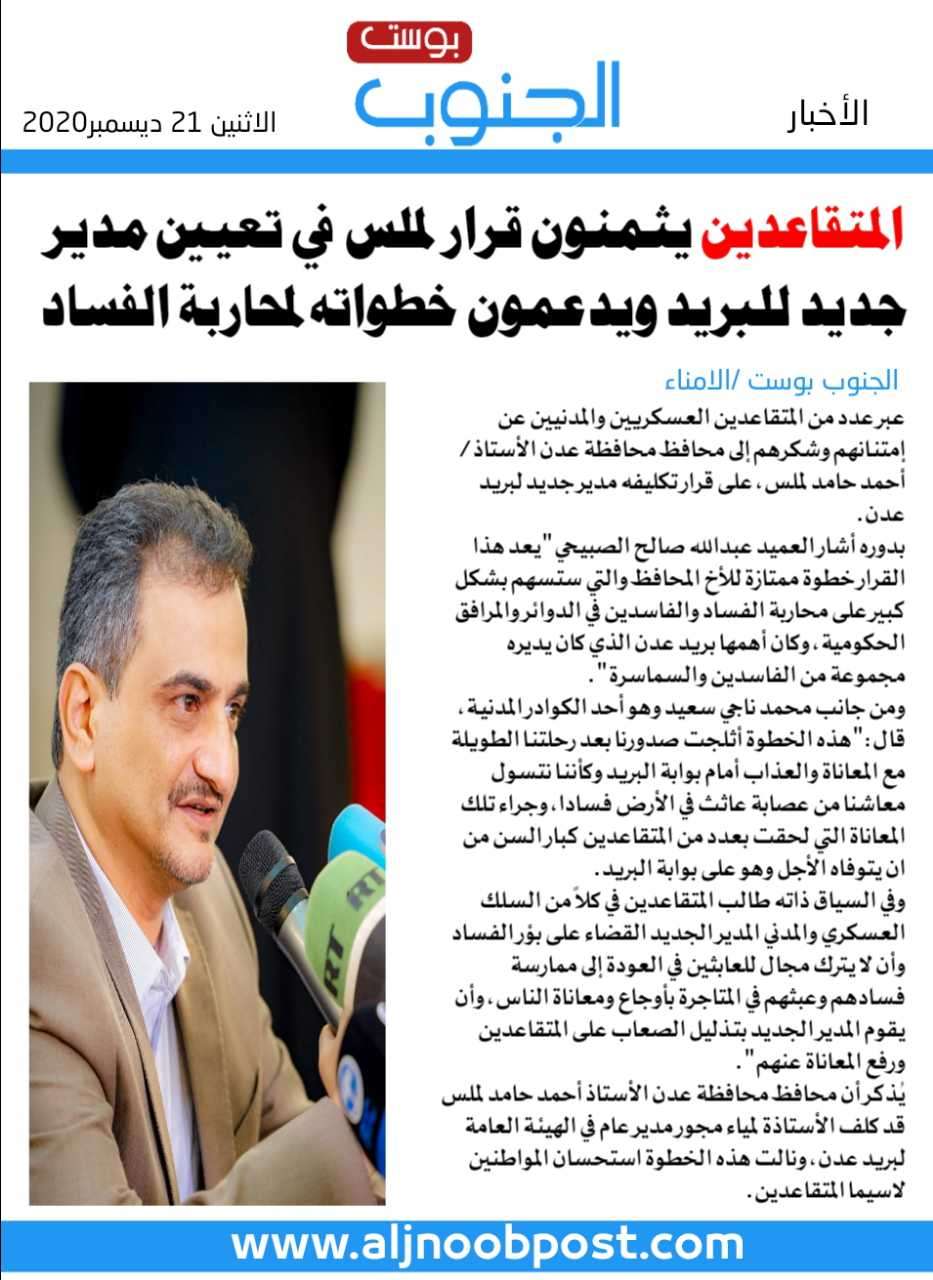 عبر عدد من المتقاعدين العسكريين والمدنيين عن إمتنانهم وشكرهم إلى محافظ محافظة عدن الأستاذ/أحمد حامد لملس، على قرار تكليفه مدير جديد لبريد عدن.