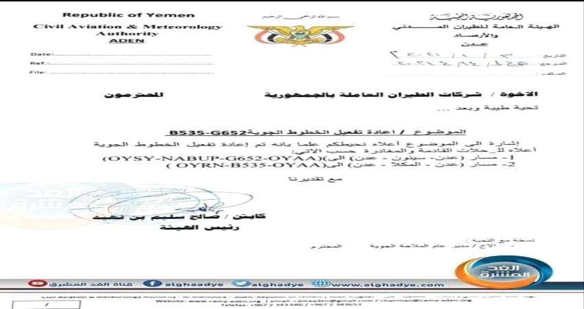وبحسب الرسالة الموجهة من رئيس الهيئة كابتن صالح سليم بن نهيد الى شركات الطيران العاملة بالجمهورية فقد تم إعادة تفعيل الخطوط الجوية للرحلات القادمة والمغادرة بحسب الاتي