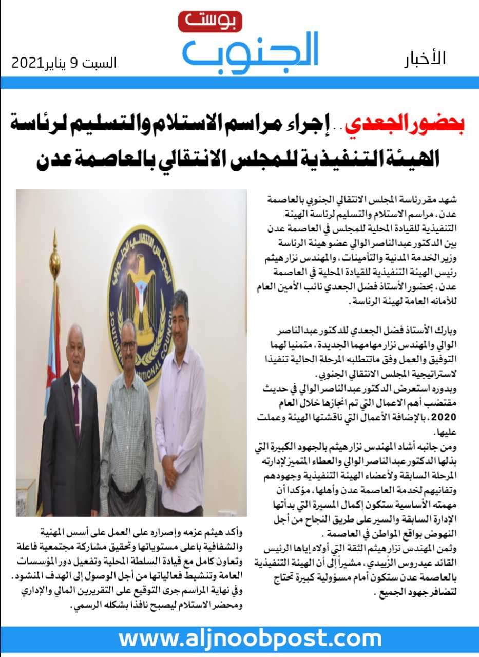 شهد مقر رئاسة المجلس الانتقالي الجنوبي بالعاصمة عدن، مراسم الاستلام والتسليم لرئاسة الهيئة التنفيذية للقيادة المحلية للمجلس في العاصمة عدن بين الدكتور عبدالناصر الوالي عضو هيئة الرئاسة وزير الخدمة المدنية والتأمينات، والمهندس نزار هيثم رئيس الهيئة التنفيذية للقيادة المحلية في العاصمة عدن، بحضور الأستاذ فضل الجعدي نائب الأمين العام للأمانه العامة لهيئة الرئاسة.