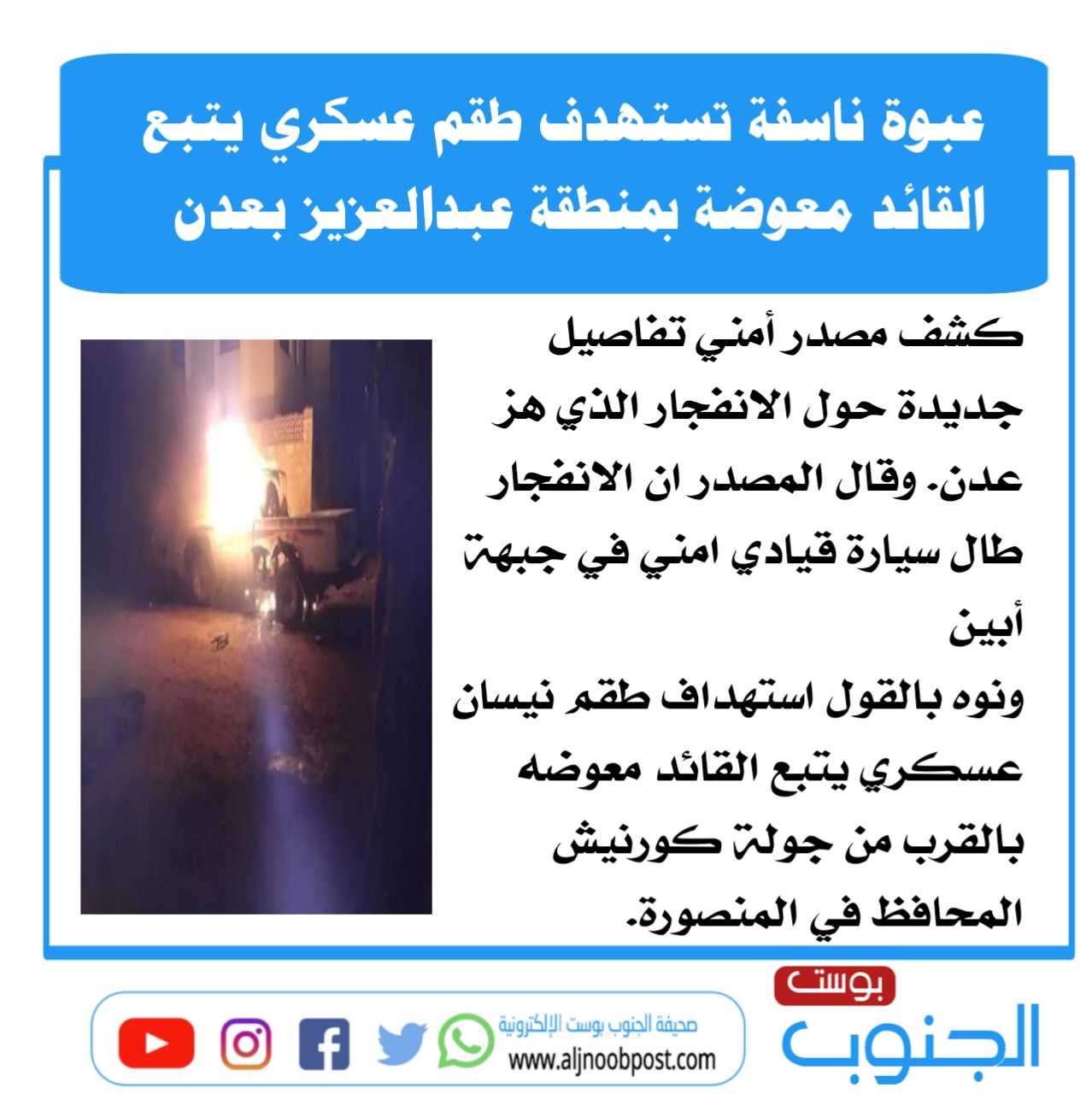 ونوه بالقول استهداف طقم نيسان عسكري يتبع القائد معوضه بالقرب من جولة كورنيش المحافظ في المنصورة.