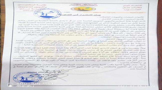 تأسف قيادة نقابة المعلمين والتربويين الجنوبيين العاصمة عدن عن كل ما يلحق بالعملية التعليمية من اضرار,, وتشعر بخيبة الأمل من تنصل الحكومة الدائم عن التزاماتها تجاه مطالب المعلمين وتعريضها بذلك العملية التعليمية للإرباك والعرقلة والتسبب بتعطيل انفراج ازمة التعليم وخاصة بعد اللقاء الذي تم بين قيادة نقابتنا العامة ورئاسة الوزراء يوم الاربعاء بتاريخ 10/2/2021م والذي تمخض عنه تشكيل لجنة من وزير التربية والتعليم ووزير الخدمة المدنية ووزير المالية لإعداد آلية مستعجلة لصرف طبيعة العمل لموظفي 2011 وكذا صرف العلاوات السنوية لكافة القطاع التربوي والتعليمي على ان يكون اقصى حد للتسليم في نهاية شهر مارس 2021م ,, واما بالنسبة لبقية المطالب يتم تنفيذها على ثلاث مراحل ,, لكن وبكل اسف وبرغم الجهود التي يبذلها كلا من وزير التربية والتعليم ووزير الخدمة المدنية,, الا ان وزير المالية هو المتسبب في عرقلة عمل تلك اللجنة ,, والذي سيترتب عنه المماطلة والتسويف بحقوقنا .