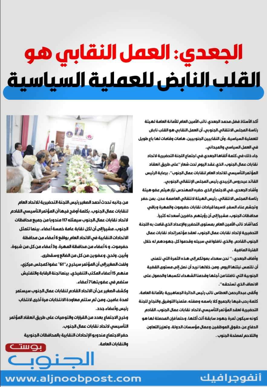 جاء ذلك في كلمة ألقاها الجعدي في اجتماع اللجنة التحضيرية لاتحاد نقابات عمال الجنوب، الذي عُقد اليوم تحت شعار “على طريق انعقاد المؤتمر التأسيسي للاتحاد العام لنقابات عمال الجنوب”، برعاية الرئيس القائد عيدروس الزُبيدي رئيس المجلس الإنتقالي الجنوبي.