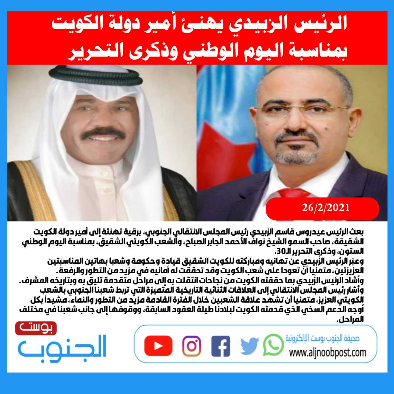 بعث الرئيس عيدروس قاسم الزُبيدي رئيس المجلس الانتقالي الجنوبي، برقية تهنئة إلى أمير دولة الكويت الشقيقة، صاحب السمو الشيخ نواف الأحمد الجابر الصباح، والشعب الكويتي الشقيق، بمناسبة اليوم الوطني الستون، وذكرى التحرير الـ30.