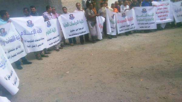 وكان المحتجون رددوا هتافات مطالبة وزارة المالية بحقوقهم دون إقصاء أو ظلم أو تهميش أسوة بالجامعات الأخرى، رافعين اللافتات التي تناشد الجهات الحكومية بسرعة البت في حل قضاياهم، ما لم فإن كل الخيارات مفتوحة.