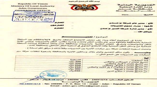 محافظ العاصمة عدن يصدر تعميماً يُلزم سائقي مركبات الأجرة بتسعيرة النقل بين المديريات "وثيقة"