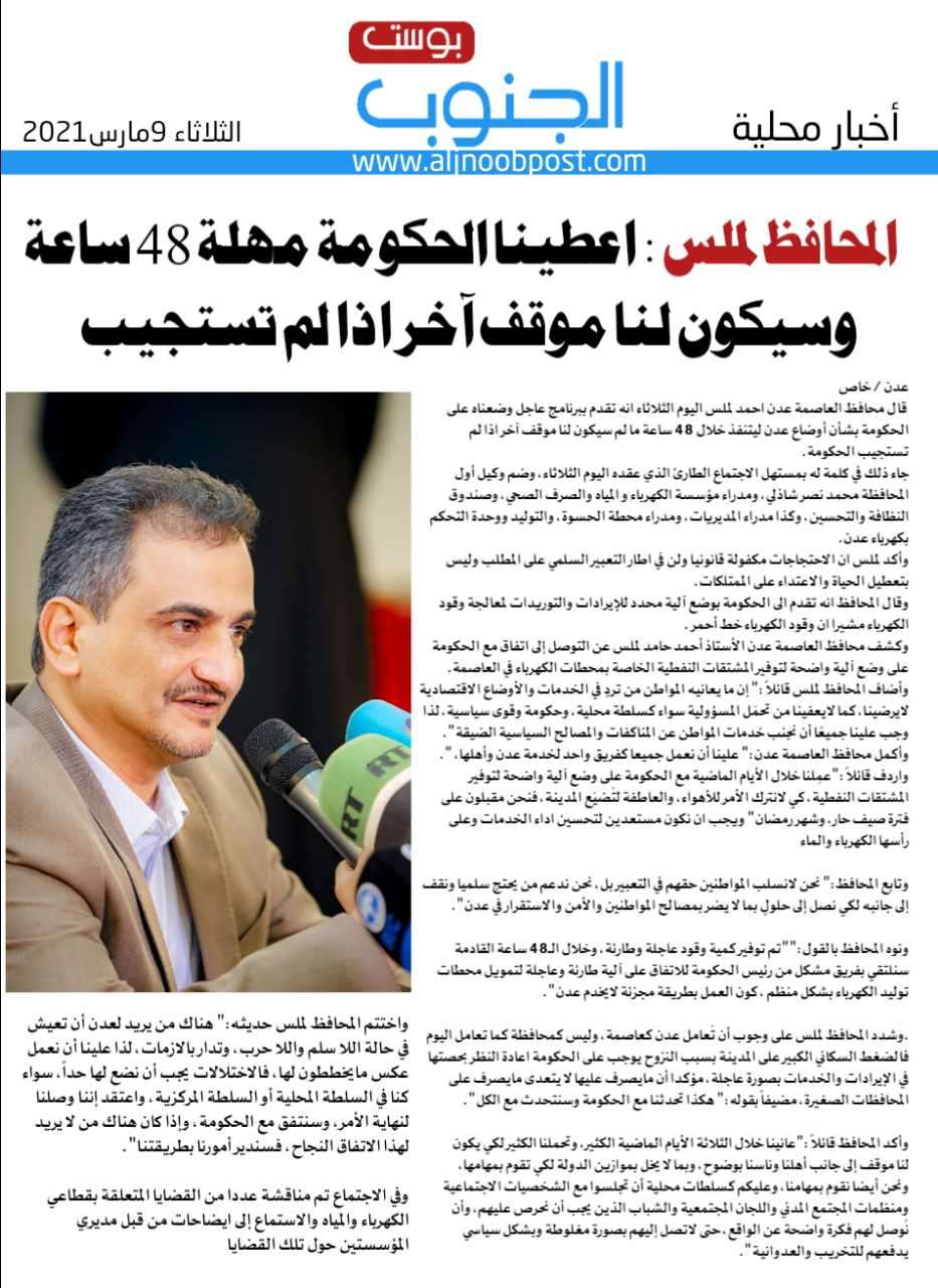 قال محافظ العاصمة عدن احمد لملس اليوم الثلاثاء انه تقدم ببرنامج عاجل وضعناه على الحكومة بشأن أوضاع عدن ليتنفذ خلال 48 ساعة ما لم سيكون لنا موقف آخر اذا لم تستجيب الحكومة.
