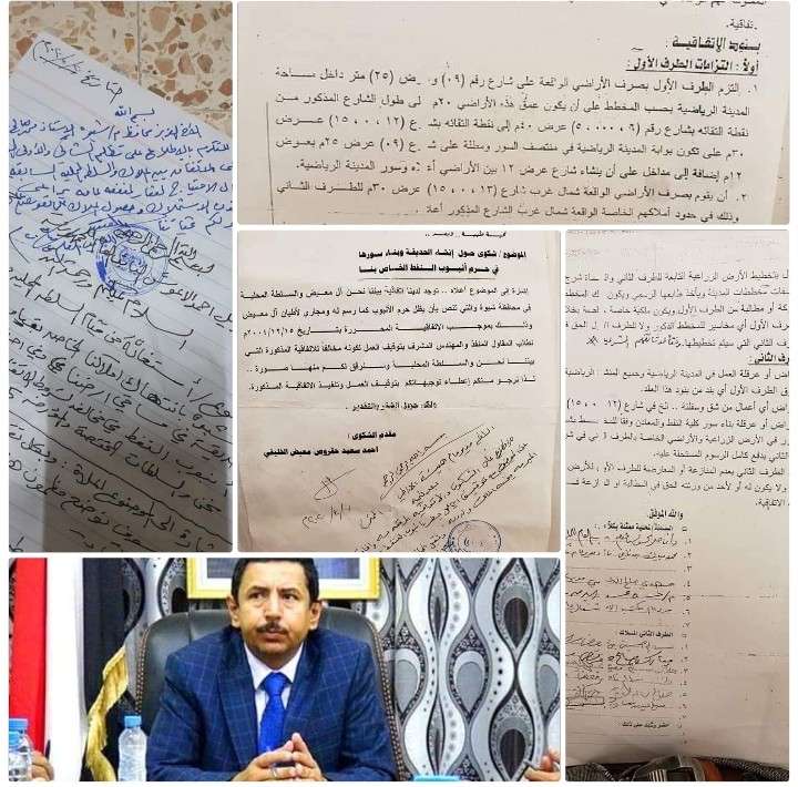 1 - قام المحافظ بن عديو في بداية شهر ابريل العام الماضي 2020م ببناء حديقة في مساقي ال معيض الواقعه بين مخططين رقم (511 - 611) بمدينة عتق وعلى شارع عرض 40 م طريق العبر وذلك بالمخالفة للاتفاقية المبرمة بيننا نحن والسلطه المحليه السابقة بالمحافظة الخاصة بالمدينه الرياضية والذي نص على ان تبقئ مساحة الارض المذكورة كما رسم لها مساقي لارض ال معيض وحرم انبوب النفط ويمنع صرف اراضي فيها وللاسف لم تلتزم السلطه بذلك وتم بناء فيها حديقة بالقوة وعند احضار اوامر من قبل نيابه الاموال بوقف العمل في ملكيتنا الخاصه لم يحترموا توجيهات القضاء ورفضوا التوقف عن العمل وعند اعتراضنا على ذلك قام المحافظ بسجن 3 ثلاثه من اهلي وحجزهم في معتقل قوات النجدة ولم يفرج عنهم الا بضمانه عدم اعتراض العمل في الحديقة واستمر بالعمل بالقوة في املاكنا ودون مراعاه واحترام لحقوقنا ولا للاتفاقية التي تمت بيننا والسلطه المحليه السابقه بالمحافظة بل وعند احضار توجيهات من قبل الناب العام بالجمهورية صادرة بتاريخ 2020/4/22م تطالب الاخ بن عديو المحافظ بالوقوف اولآ على الاتفاقية المبرمه بين المالك ال معيض والسلطه المحليه السابقة بالمحافظة وفي حاله الاحتياج للارض للمنفعة العامة يراعئ قانون الاستملاك وحصول المالك على تعويض عادل وللاسف الشديد لم يتم احترام توجيهات النائب العام للجمهوريه ولم يتم تنفذها في المحافظة وتم نهب الارض مننا بقوة السلطة وبدون وجه حق وبدون ان يصرف لنا اي تعويض .