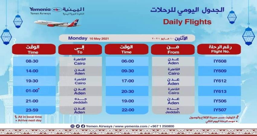 جدول رحلات الخطوط الجوية اليمنية ليوم غد الاثنين 10 مايو