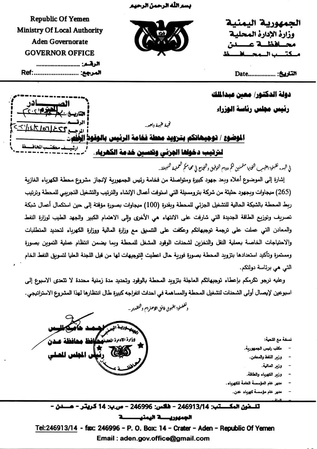 وثيقة من محافظ العاصمة عدن موجهة إلى رئيس الحكومة أشار فيه إلى الجهود الحثيثة التي بذلها الرئيس عبدربه منصور هادي وشركة بترومسيلة لانجاز مشروع محطة الكهرباء الغازية.
