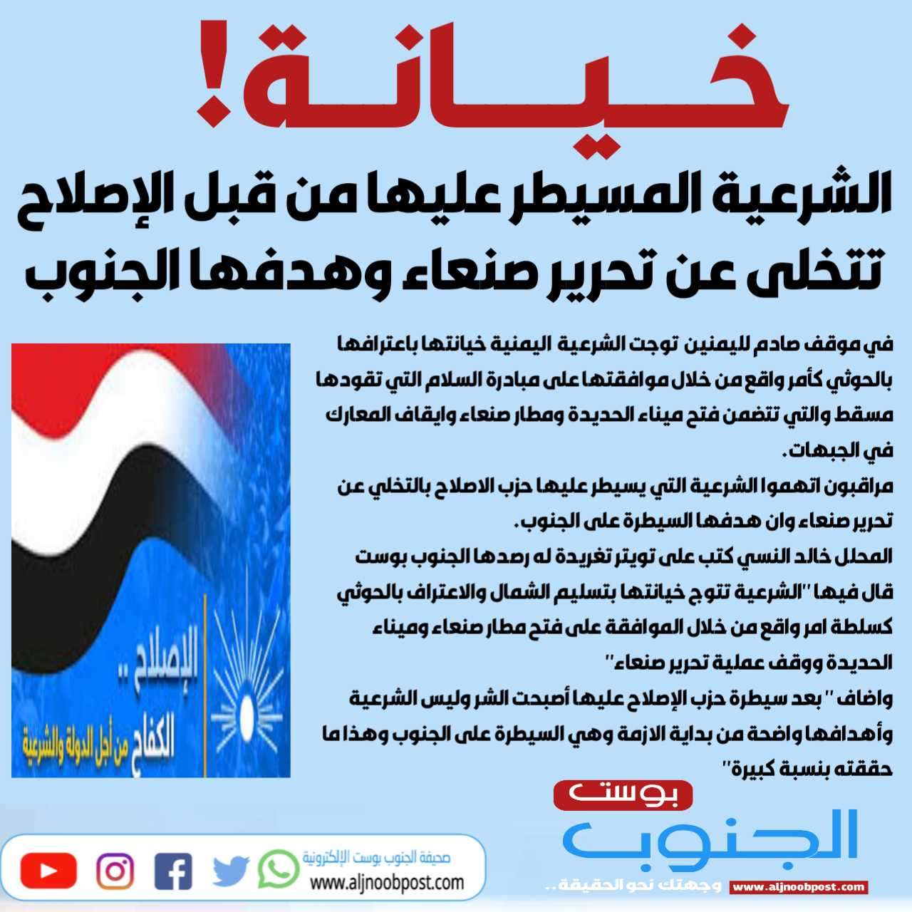 المحلل خالد النسي كتب على تويتر تغريدة له رصدها الجنوب بوست قال فيها "الشرعية تتوج خيانتها بتسليم الشمال والاعتراف بالحوثي كسلطة امر واقع من خلال الموافقة على فتح مطار صنعاء وميناء الحديدة ووقف عملية تحرير صنعاء"