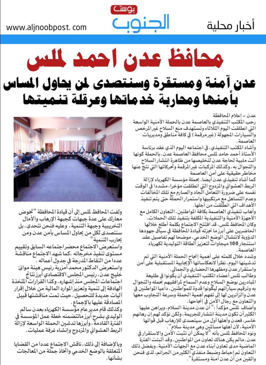 ونوّه المحافظ لملس بأنه "لا يمكن أن تثبت الأمن والاستقرار في عدن، مالم يكن هناك تعاون من المواطنين، وقد أثبتت الفترة الماضية مدى تعاون أبناء عدن مع الجهات الأمنية، وبفضل ذلك التعاون تم إحباط وضبط منفذي الكثير من الجرائم، لذى فنحن واثقين من أن عدن آمنة ومستقرة".